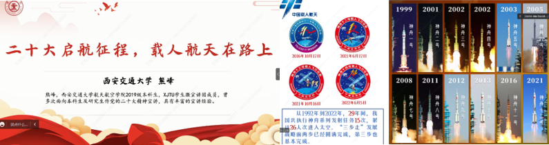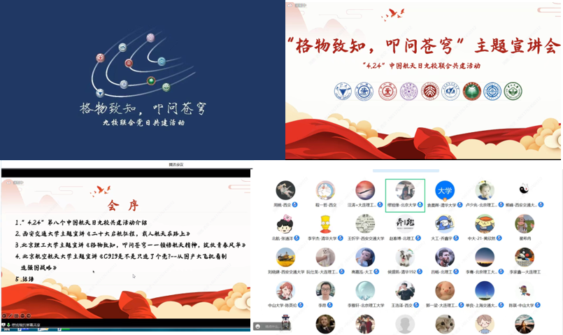 博士生21051学生党支部、西安交通大学航空航天2022级硕士第四党支部、中山大学法学硕士党支部共同开展了中国航天日主题党日活动,希望能够整合各地的优势资源,分享支部建设方面的经验,促进各校的之间的交流和合作。本次宣讲活动采取线上的方式进行,来自9个学校的190余名学生党员参与观看。