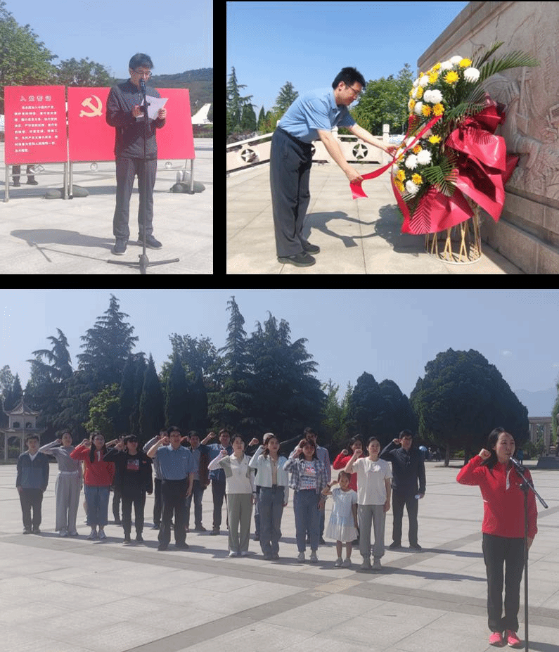 党委委员刘振同志为敬献的花篮整理缎带,全体党员鞠躬表达了对革命先烈们的深切缅怀和崇高敬意。在院办党支部书记陈妮同志的领誓下,大家高举右手,面对鲜红党旗,重温了入党誓词,用铮铮誓词铭初心、恪承诺。