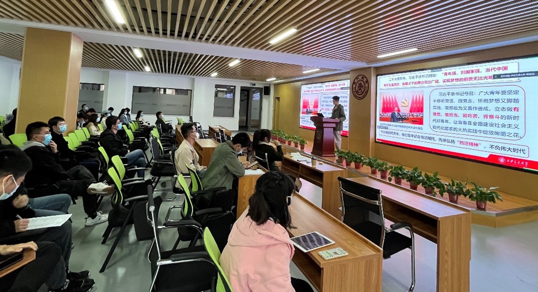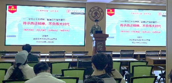 我院博士力学第二党支部的张臻杰代表西安交大进行领学,报告题目为“传承西迁精神,不负伟大时代”,主要介绍了西迁精神的由来和形成以及西迁精神的时代内涵。