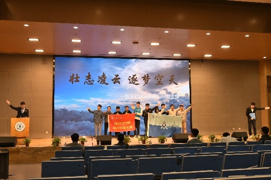 决赛答辩最后,硕2089支部15名同学上台展示班旗和院旗,喊出“壮志凌云、筑梦空天!”的口号!并放出自制纸飞机与模型飞机,表达了航天学子放飞理想、展翅翱翔,在强国之路上贡献出自己力量的美好祝愿!向全校同学展示了航天学子的自信和风采!