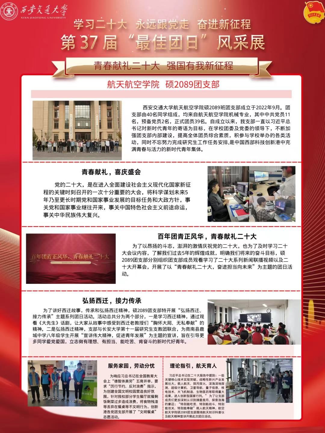 自学校“最佳团日”活动启动以来,硕2089团支部以“青春献礼二十大,强国有我新征程”为主题,从思想、行动、未来三条主线展开小专题活动。在“青春献礼,喜庆盛会”活动中,支部全体成员观看学习二十大会议内容,并开展了宣誓活动,表达了航天学子对祖国的美好祝愿。在“弘扬西迁,接力传承”活动中,支部成员通过观看学习大先生系列话剧,学习感受西迁老教授们“胸怀大局、无私奉献”的精神。支部还联合长安大学研究生支教团为商南县鹿城中学八年级学生开展西迁精神与载人航天精神宣讲,让西迁精神走入更多人的视野,引导更多同学立志做有理想、有担当、能吃苦、肯奋斗的新时代好青年。除了理论学习之外,支部成员还积极践行志愿精神,通过 “光盘行动打卡”、“打扫阳光书屋“、“文明餐桌”等志愿活动,为同学们老师们办实事,共同建设美丽新港。除以上活动外,支部还与马克思主义赌博网站