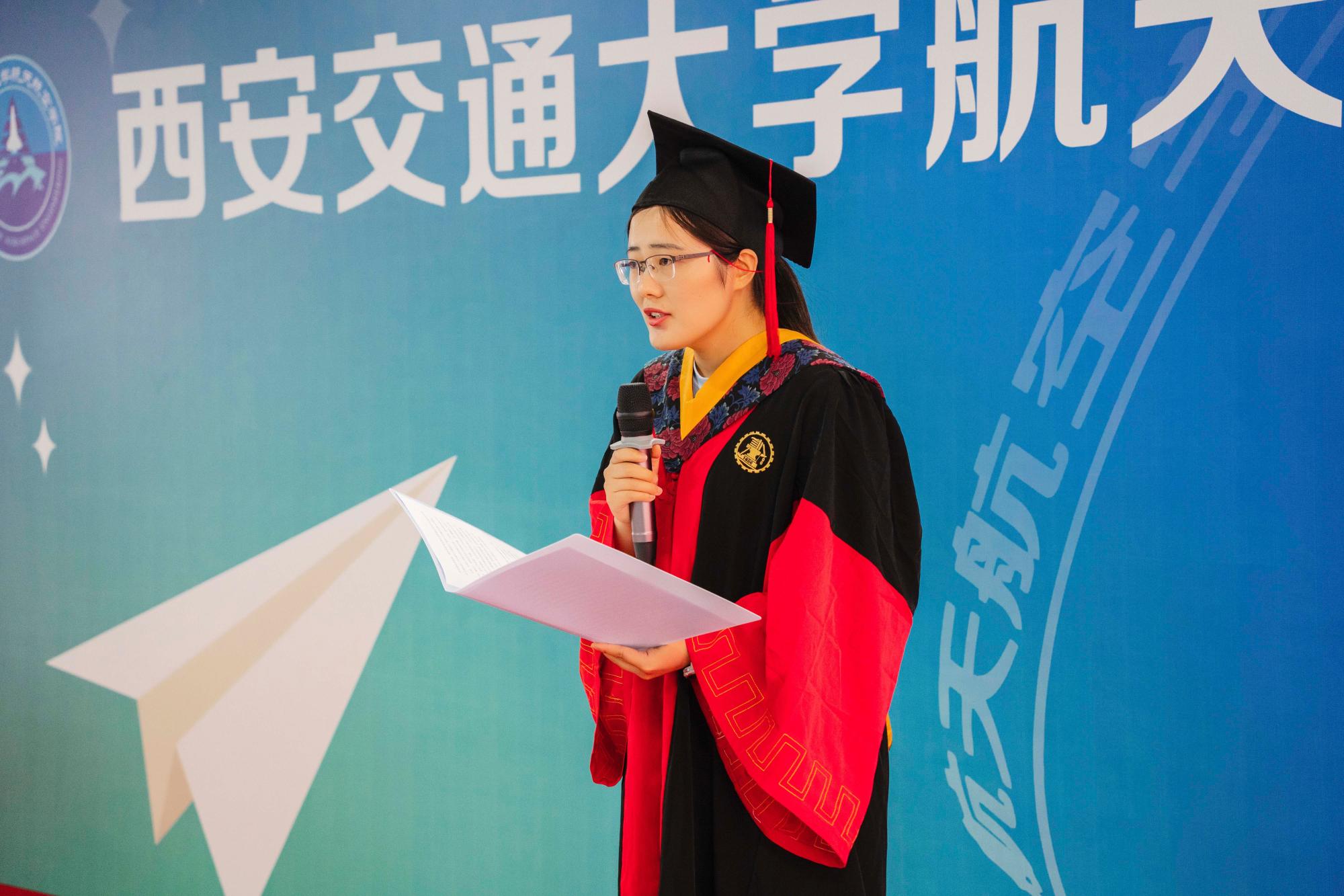 2022级研究生毕业生发言,她谈到,读研期间通过参与科研项目、学科竞赛、国内外学术会议,不仅锻炼了自己的科研能力,还提高了统筹能力、沟通能力和团队协作能力,拓宽了学术视野,毕业后她选择了到中国航天科技集团有限公司第四研究院工作,将勇敢地承担起交大人所应担负的国家使命和社会责任,以实际行动为母校增光添彩。