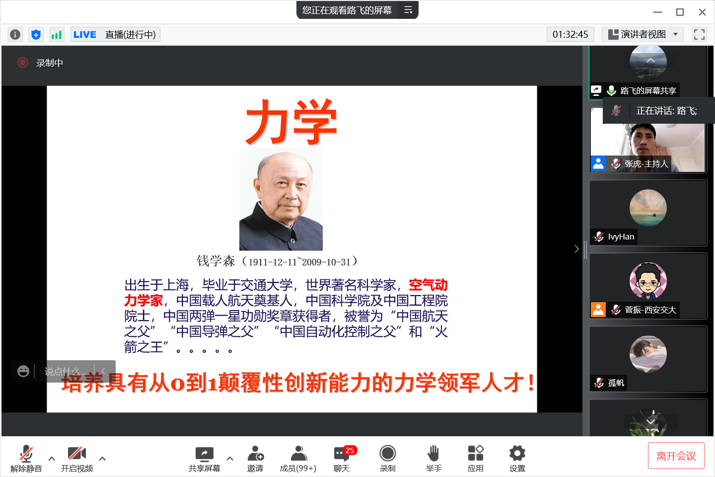 工程力学系副主任张杰教授介绍了工程力学专业的发展历史、研究方向、办学条件和毕业生就业情况,向同学们未来就读工程力学专业表示欢迎。空天工程系主任雷蒋副教授介绍了空天工程系相关学科与专业、历史沿革与专业荣誉、学科方向与背景、科研条件、承担的重大项目、毕业生就业前景等情况。