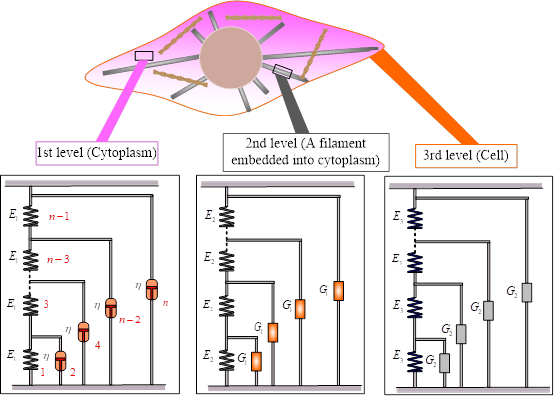 为了探究细胞在不同频率尺度下的流变学行为,西安交通大学徐光魁教授团队通过考虑细胞骨架的多级结构特征,建立了细胞的自相似多级结构模型(图1),结合实验结果发现:在低频率下,细胞的储能模量和耗能模量均表现出对频率的弱幂律依赖性;在高频下,储能模量近似为常数,而耗能模量与频率成线性关系。此外,自相似多级结构模型的转折频率可以描述不同细胞状态或类型的粘弹性力学响应差异,还可以定量地表征恶性肿瘤细胞与健康细胞的差异。