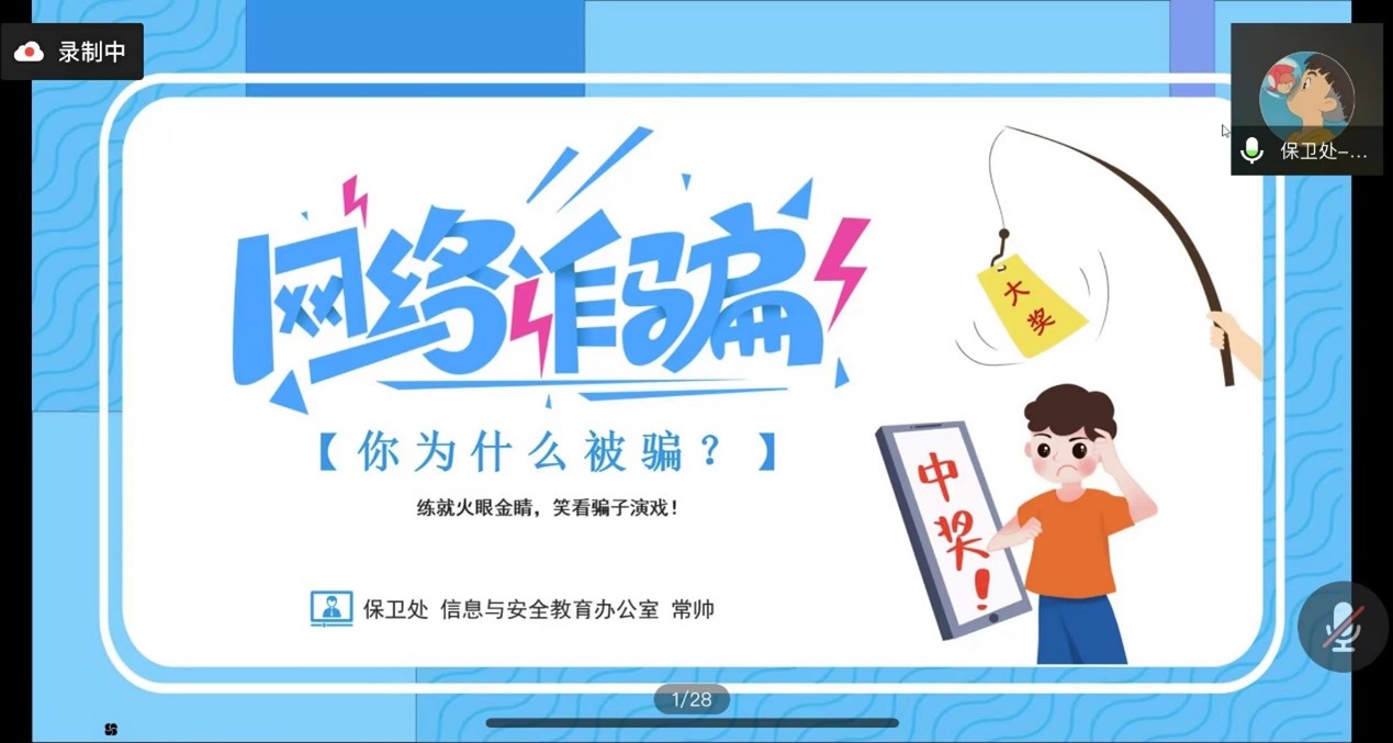 常帅首先将诈骗的特点总结出了几个成语,并通过看图猜成语的方式来与同学们互动,激起了同学们的热情反馈。接着,常老师通过四个方面对电信诈骗作了详细的讲解:一是什么是电信诈骗,对电信诈骗的定义、校园常见的诈骗类型以及当前诈骗案件的特点进行了讲解;二是对当前电信诈骗的套路进行了剖析,包括征信类诈骗、刷单类诈骗等等;三是从心理学角度分析了受骗心理,例如陌生人效应以及沉没成本效应等等;四是如何防范诈骗,常老师强调,无论什么时候都不要轻易泄露自己的信息,要做到“不听、不信、不转帐”,有疑问可以及时向辅导员、学校保卫处求助。