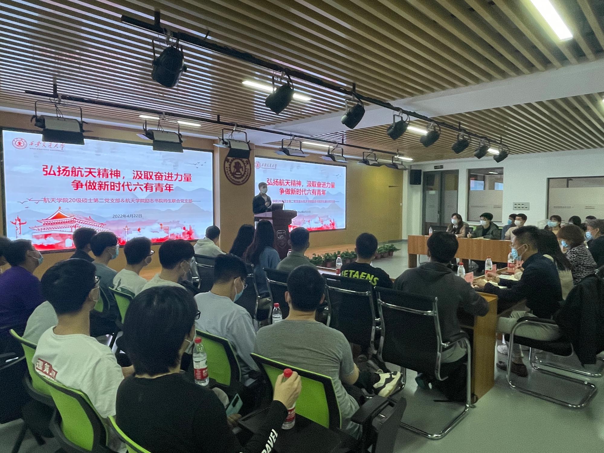 20级第二党支部成员、国家奖学金获得者王志国同学分享了自己学习、科研、工作、社会实践的经历,并向同学们发出了“走出宿舍、走出网络、走进操场、走进图书馆”的号召。