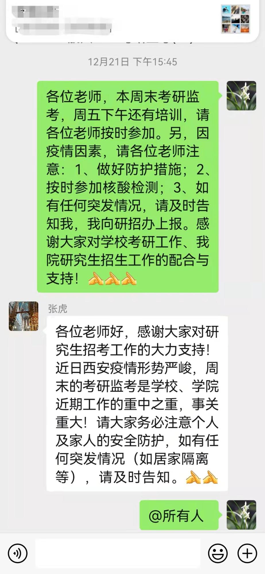 根据研究生院安排,我院选派了20名经验丰富、认真负责的教职工担任2022年硕士研究生入学考试监考工作。从12月中旬开始,西安疫情进入严峻态势,考研前2周,一方面通过网页、qq群、微信群等途径通知考生填写情况摸排,了解考生动态信息,另一方面,每日动态统计监考老师身体状况,提醒防疫要求,制定协调预案,一旦出现突发情况立即上报并启动补救措施。考研前,院长助理张虎代表赌博网站