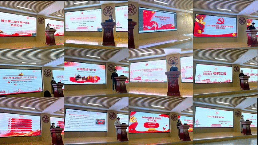 15个研究生党支部依次对2021年度的工作进行了汇报。各支部书记从支部建设、“三会一课”和党日活动开展情况、支部特色以及存在问题和2022年工作的展望等方面进行展示汇报,既展示了党建工作开展的亮点与特色,又客观分析了2021年度研究生党支部工作存在的难点与不足,并提出2022年的支部工作计划。最后党支部间开展了现场评议,以相互评分的方式对每个党支部的工作进行考评。