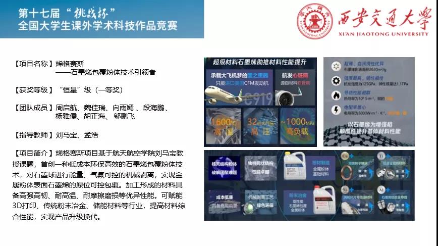 、全国学联和四川省人民政府共同主办的第十七届“挑战杯”全国大学生课外学术科技作品竞赛“黑科技”专项赛落下帷幕,我院学子项目《烯格赛斯----石墨烯包覆粉体技术引领者》获“恒星”级(一等奖)。西安交大在此次专项赛道中获“星系”级(特等奖)2项, “恒星”级(一等奖)3项,“行星”级(二等奖)1项,“卫星”级(三等奖)3项。