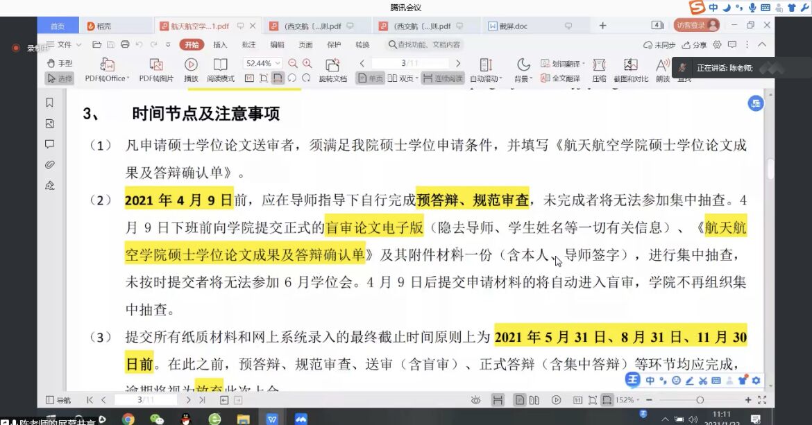 硕士学位申请实施细则》文件内容,主要介绍了学位申请条件、评审方式等。随后,陈老师重点对硕士毕业生学位申请流程进行了详细阐述,强调了其中几个关键节点和注意事项,以及避免学术不端行为的重要性。