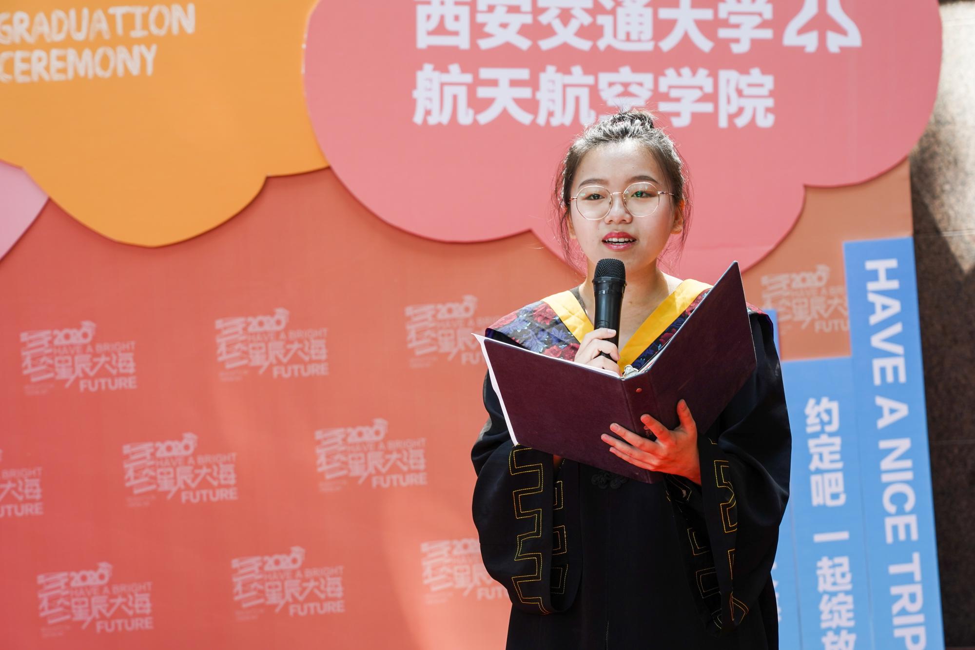 硕7075班周俊辰代表研究生毕业生发言,他表示,感谢交大的培养,让他坚定的继续在祖国最需要的地区从事航天领域科研工作。他表态将以更严谨的学术态度,更高格局的人生规划来践行西迁精神,在今后的工作岗位上踏踏实实做研究,精益求精搞制造,为建设科技强国、空天强国贡献自己的力量,用奋斗书写新时代最美的华章!