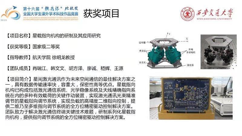 11月9—12日,由共青团中央、中国科协、教育部、中国社科院、全国学联、北京市人民政府联合主办的第十六届“挑战杯”全国大学生课外学术科技作品竞赛在北京航空航天大学举办。我院学子肖瑞江等《星载指向机构的研制及其应用研究》(指导教师:徐明龙教授)项目荣获全国二等奖。此次比赛,西安交通大学代表队共获得2个一等奖、4个二等奖的优异成绩,并与浙江大学、上海交通大学等高校一同捧得大赛“优胜杯”。