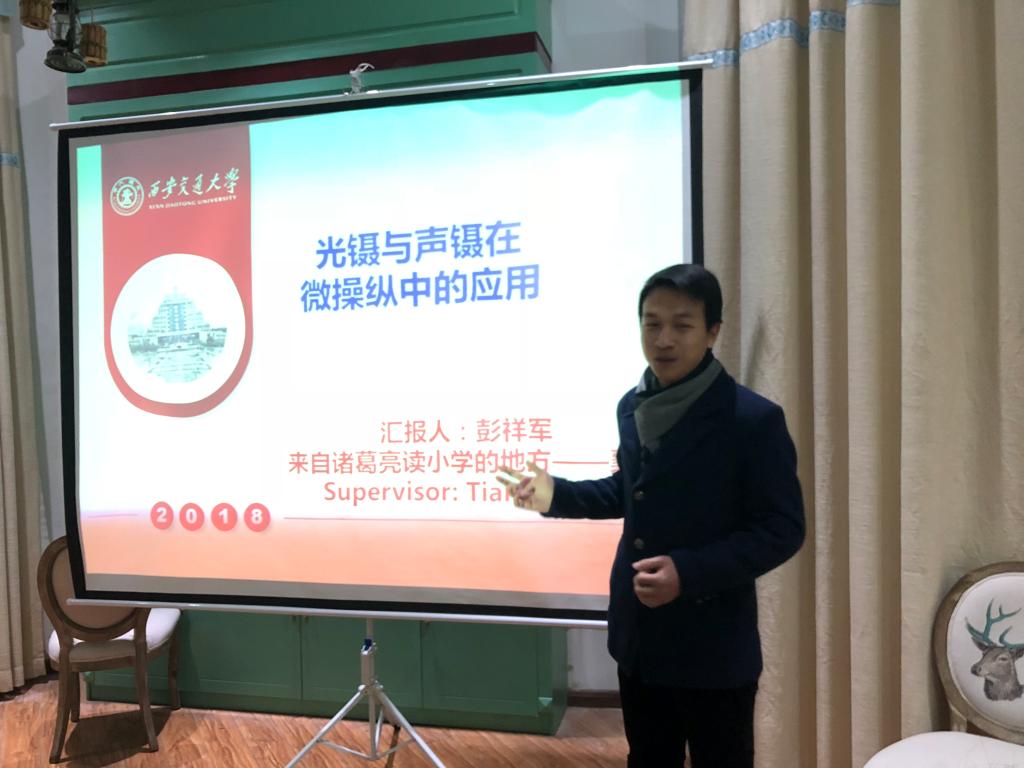 一年级博士生,致力于声-力与光-力的耦合研究。彭祥军的分享主题为“光镊与声镊在微操作中的应用”,声镊与光镊,顾名思义,它们是利用声波或者光波抓住物体的工具。首先,光镊是将其光辐射压力应用到挪动微粒、弯曲液面、掰弯硬物、拉伸细胞、激光冷却、光辐射力和软物质方面,而且光镊相关研究结果已经获得2018年的诺贝尔物理学奖。彭祥军继续讲到目前的研究课题,超声波同样可产生声辐射力,利用其对细胞进行微操纵,进而可以应用到医疗等方面。彭祥军讲到声镊相比于光镊能够对多个对象同时操纵,并且可实现体外操作,但还存在声流如何量化,如何实现更高精度等问题。