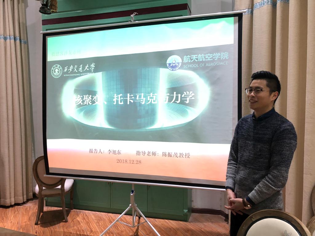 一年级博士生,致力于电磁-热-力多场耦合数值模拟的研究。李旭东分享的主题是“核聚变、托卡马克与力学”,众所周知,目前地球环境污染,能源短缺问题严重,而聚变能源是未来能源问题的重要解决方案。李旭东首先为大家讲解了核裂变及核聚变的原理和裂变堆进行的过程,列举了几种主要轻核聚变反应,其次提到聚变堆相比于裂变具有燃料充足、产物安全等优点,并重点讲解了利用磁约束得到核聚变等离子体的过程,即托卡马克装置。最后李旭东简单介绍了几种国内外的托卡马克装置,并谈及核聚变研究的现状及未来。