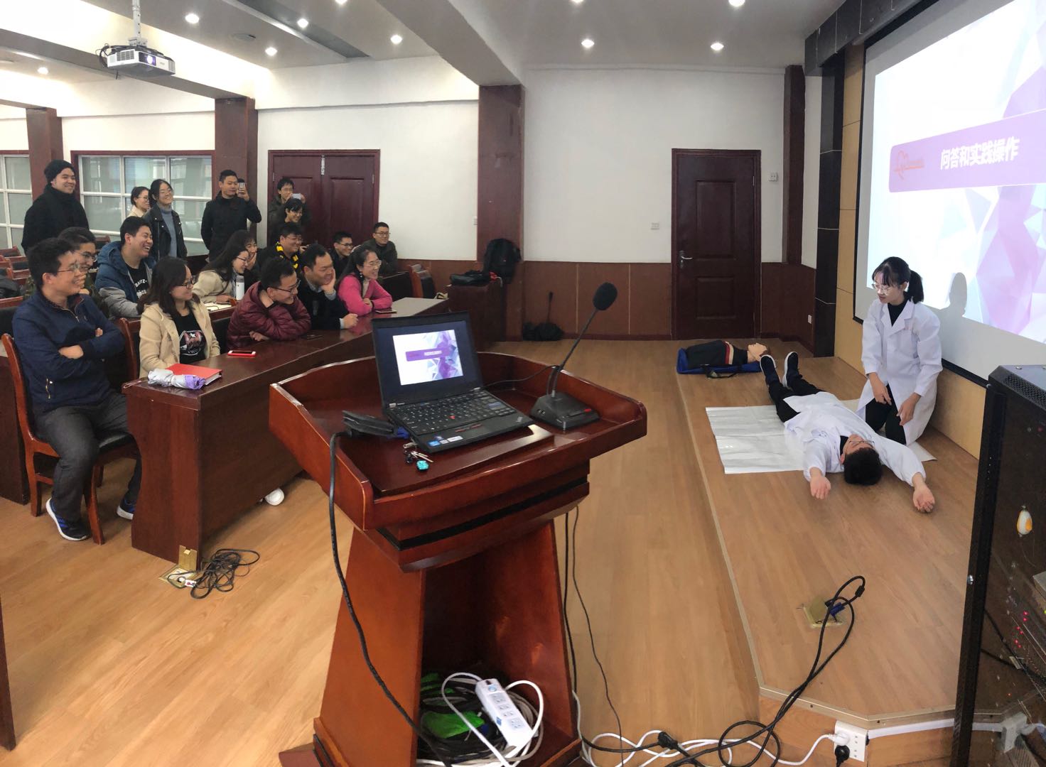 接下来,两名副队长邀请参与讲座的人员亲自上台实践,针对大家存在的错误手法进行了一一纠正并耐心讲解,使大家对急救知识和急救方法有了更直观的了解。更加重要的是让在座人员深刻理解并正确掌握了急救的相关知识。